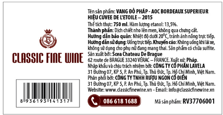 Với màu đỏ sậm, rượu vang đỏ AOC Bordeaux Superieur Cuvée De L'étoile 2015 được làm từ 100% giống nho Merlot, có hương vị của quả mọng đỏ, caramel và vani.